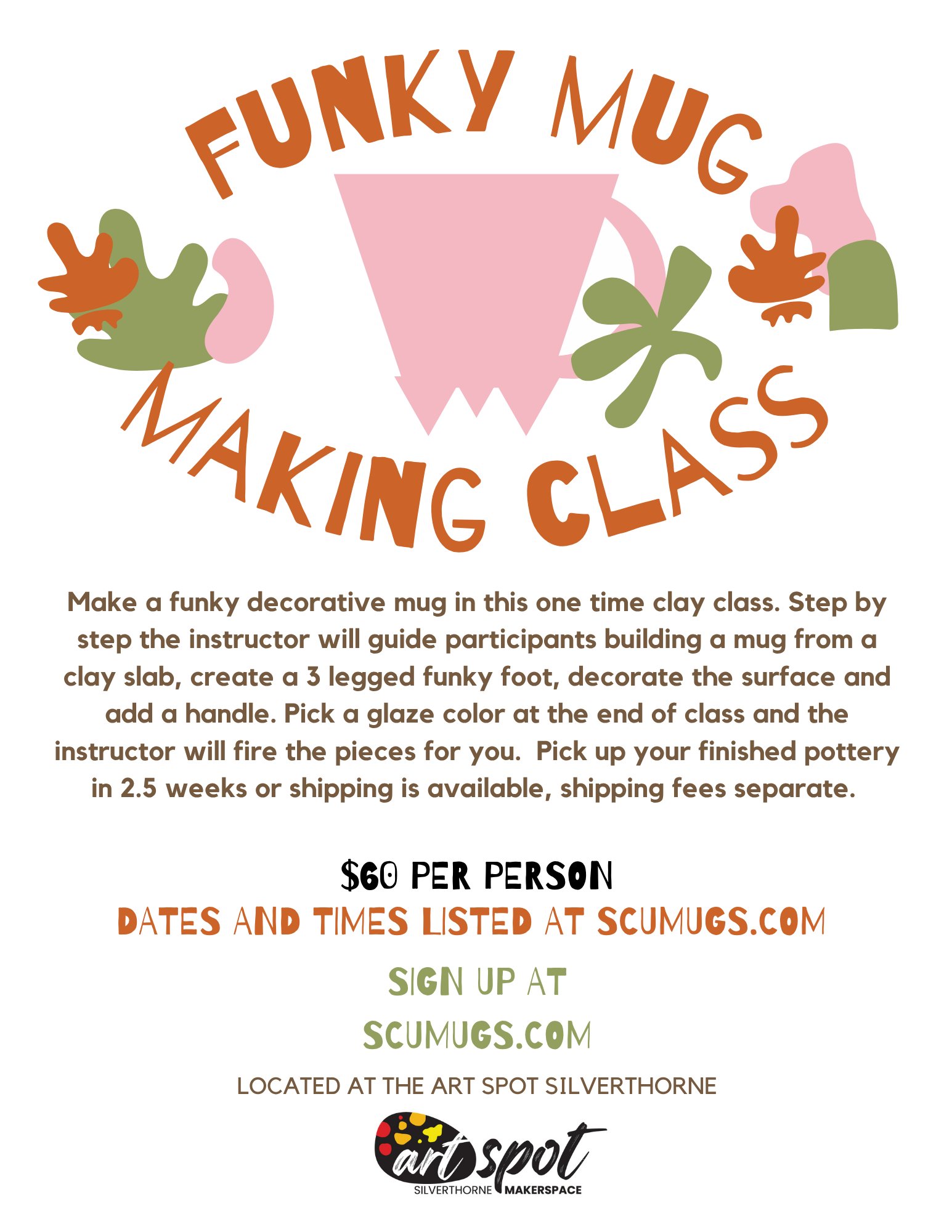 Make a funky decorative mug in this one time class. Step by step, the instructor will guide participants building a mug from a clay slab, create a 3 legged funky foot, decorate the surface and add a handle. Pick a glaze color at the end of class and the instructor will fire the pieces for you. No need to come back to finish it, you can come pick up your finished pottery in 2.5 weeks. Shipping is available for an extra fee.