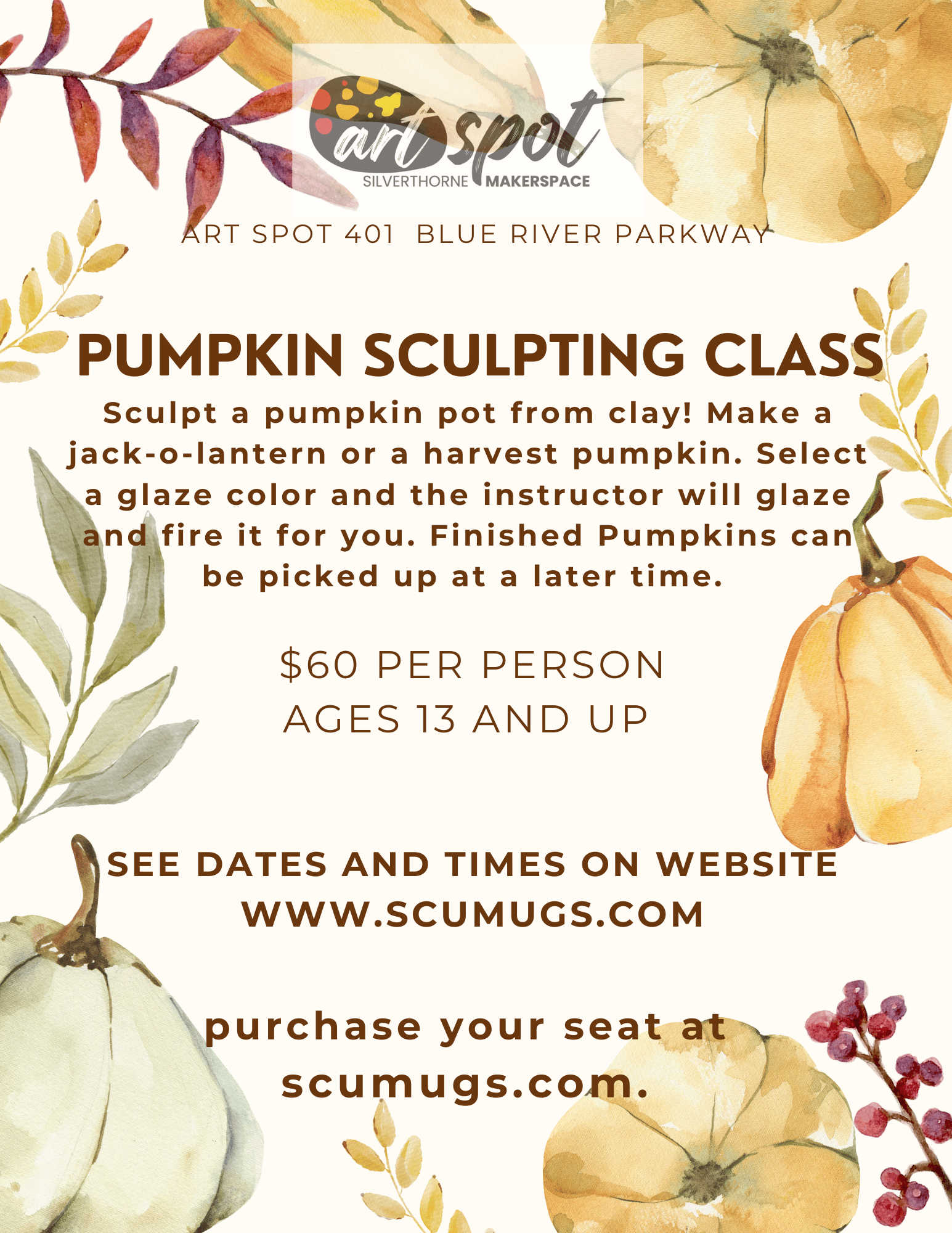 Sculpt a pumpkin pot from clay! Make a jack-o-lantern or a harvest pumpkin. Select a glaze color and the instructor will glaze and fire it for you. Finished pumpkins can be picked up at a later time. Shipping is an option for an additional fee.